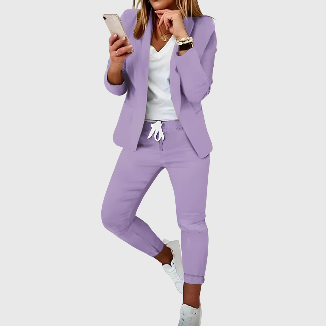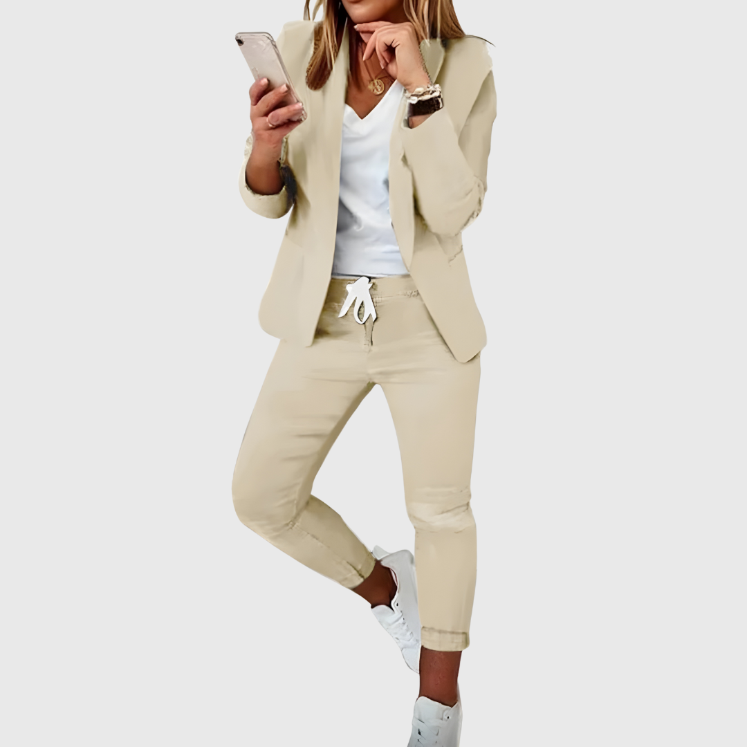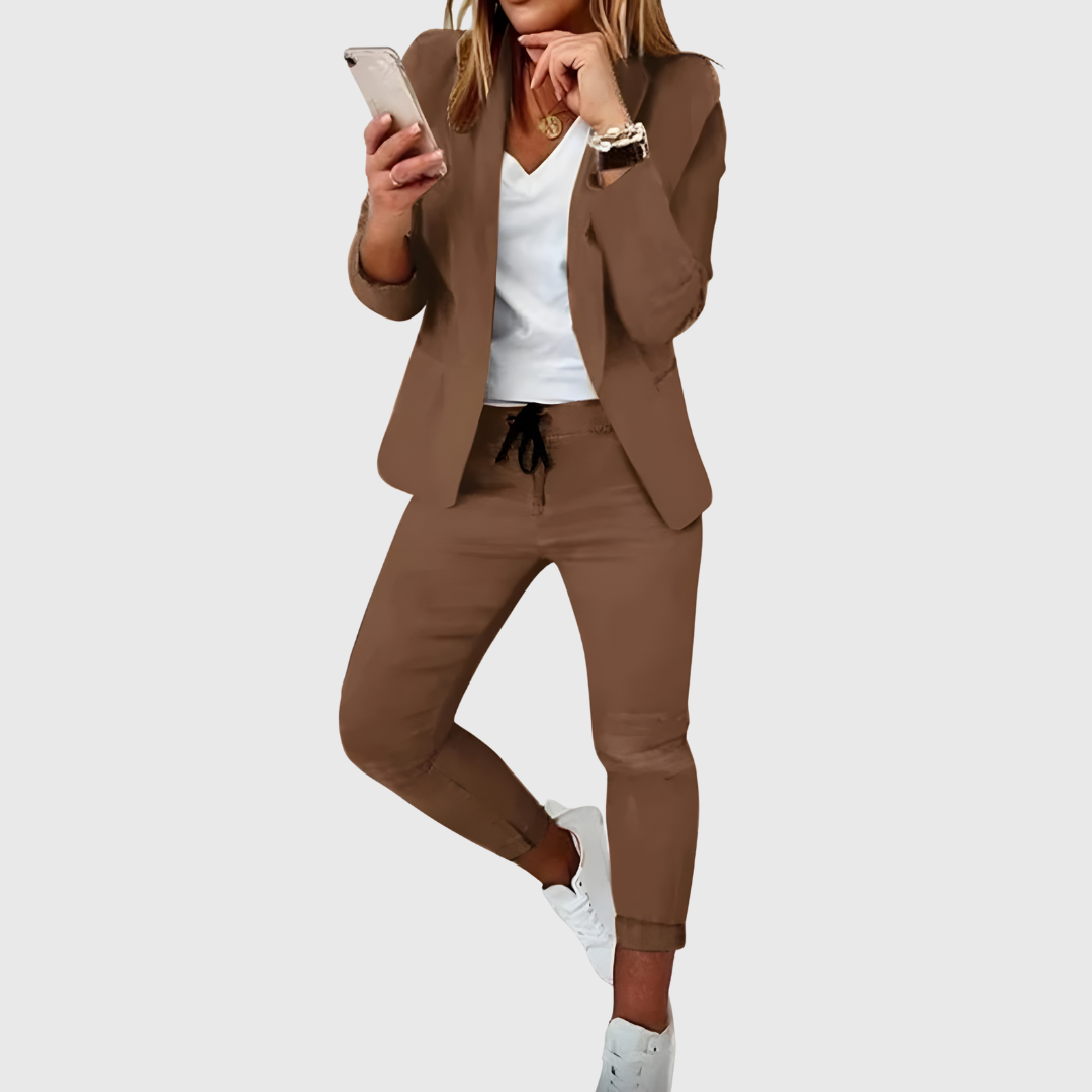 Este conjunto para mujer combina un blazer estructurado con un pantalón de corte relajado, creando una propuesta funcional y fácil de integrar en el día a día. Coordinado permite un aspecto ordenado sin esfuerzo, adecuado para actividades cotidianas y planes informales.