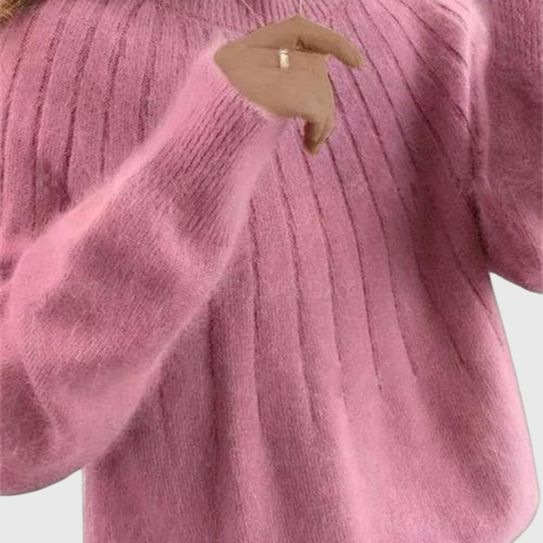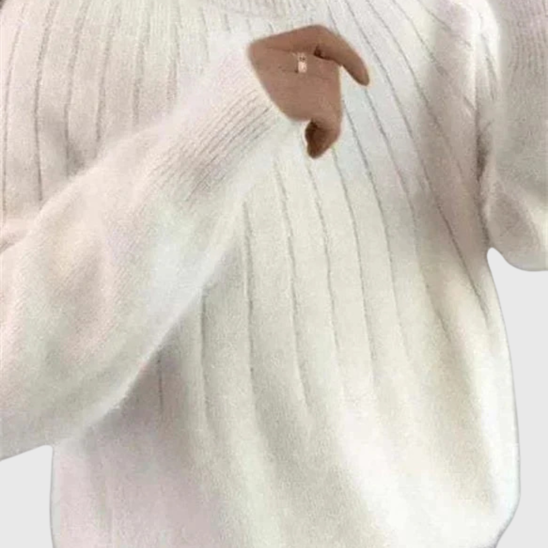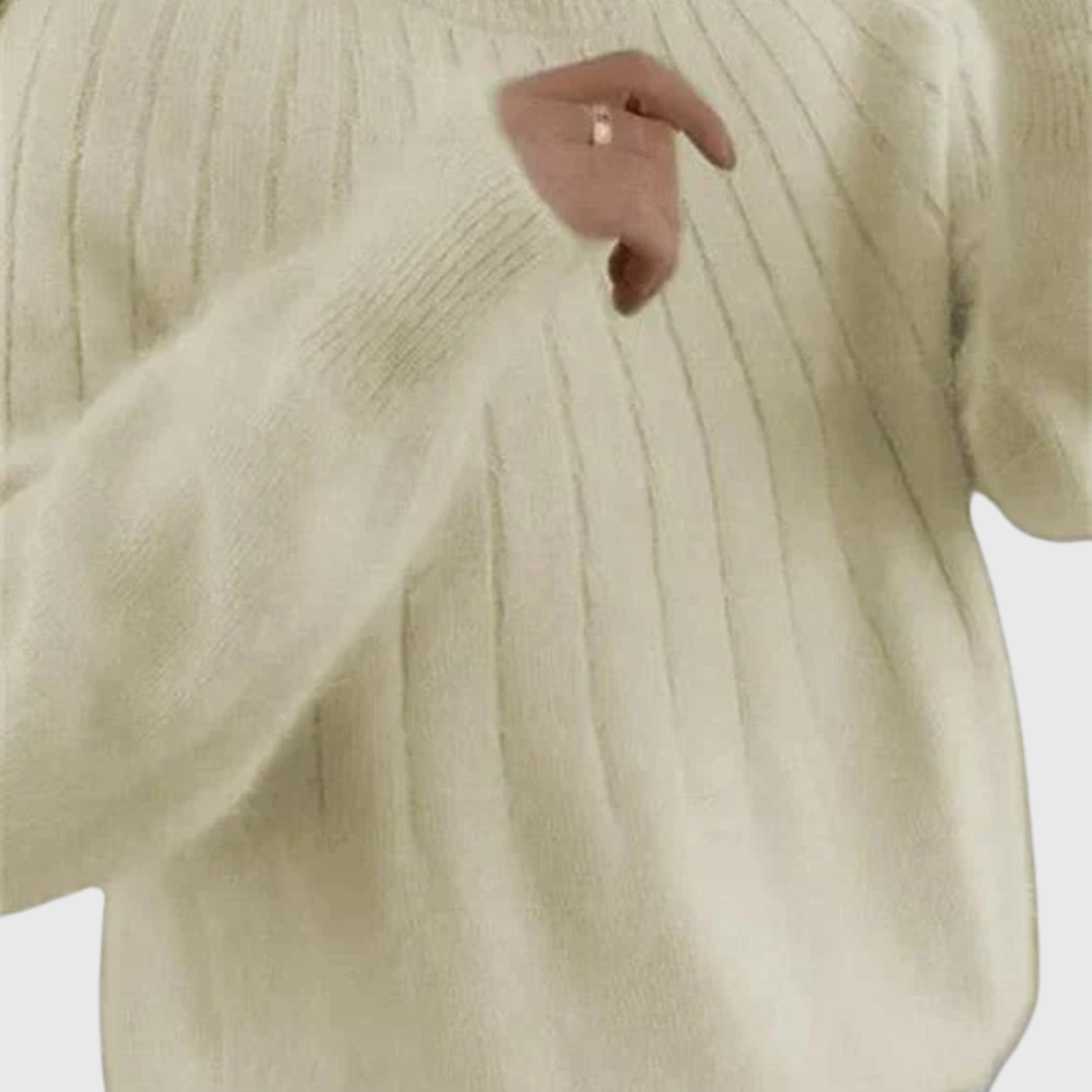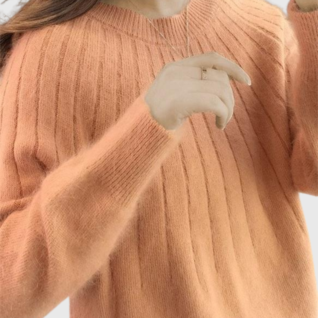 Este suéter para mujer presenta un diseño de punto con líneas verticales que añaden textura visual. El cuello redondo y las mangas amplias permiten usarlo como capa principal o combinado con otras prendas. Es adecuado para el uso diario durante la temporada fría.