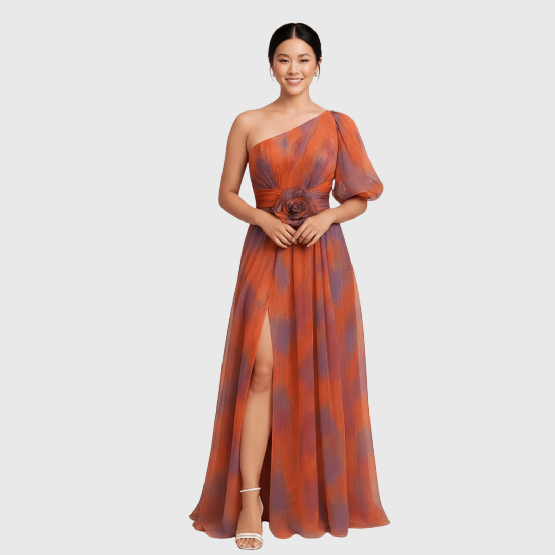 Este vestido maxi para invitada de boda presenta un diseño de un solo hombro con manga abullonada y un aplique floral en la cintura que define la silueta. El tejido ligero con efecto translúcido crea un acabado fluido, mientras que la abertura lateral facilita el movimiento en recepciones y eventos prolongados.