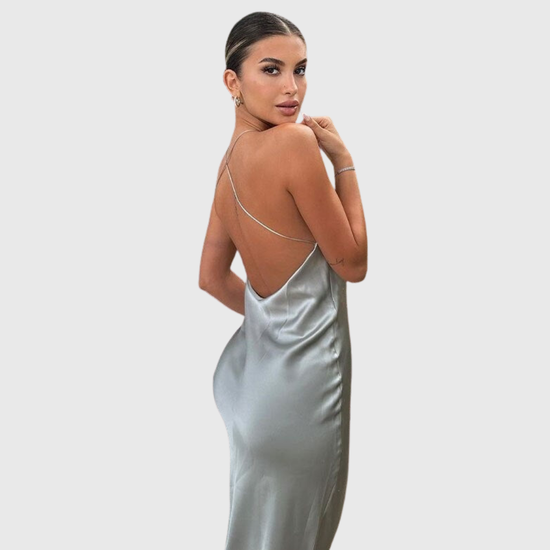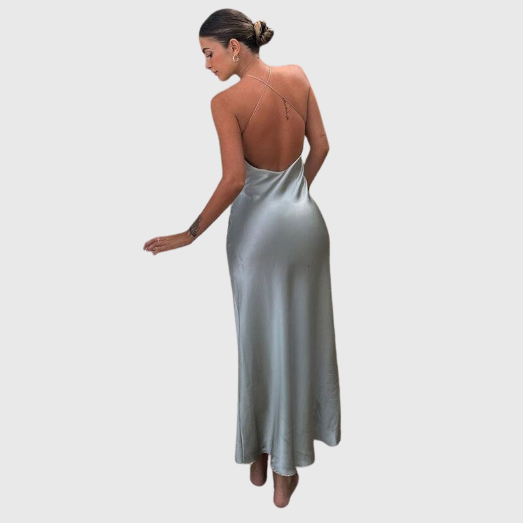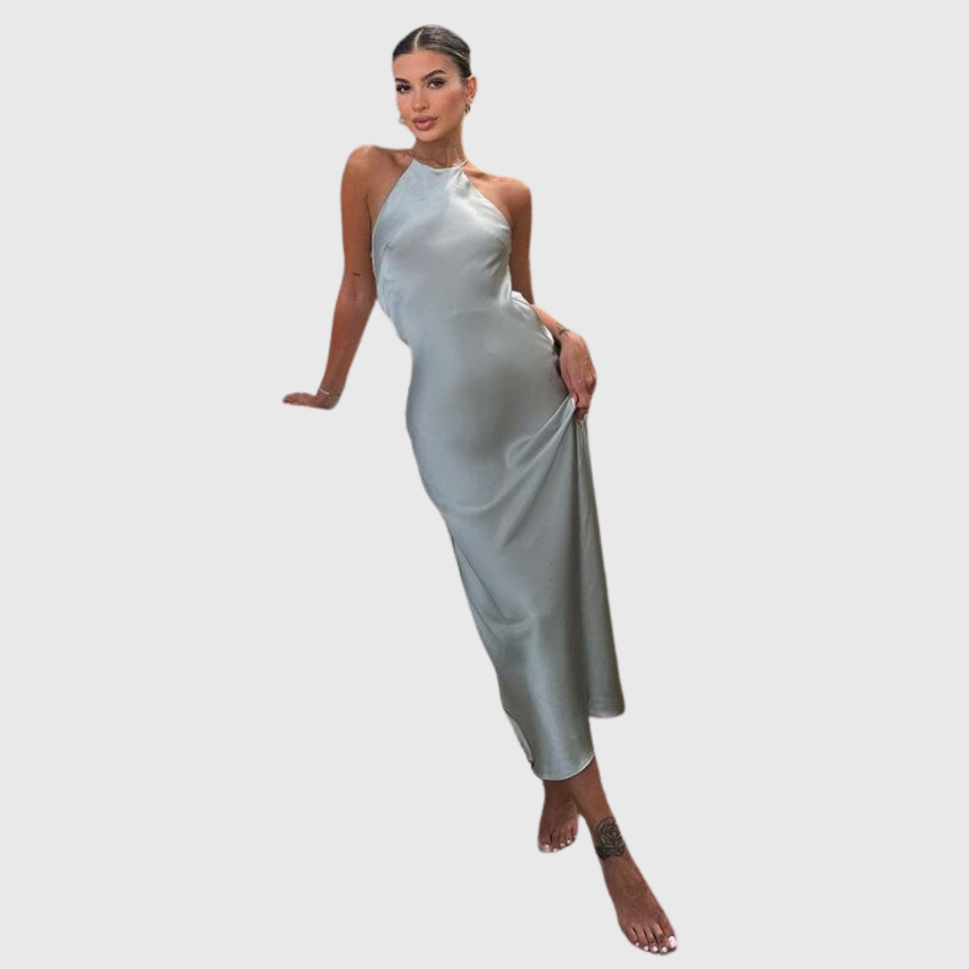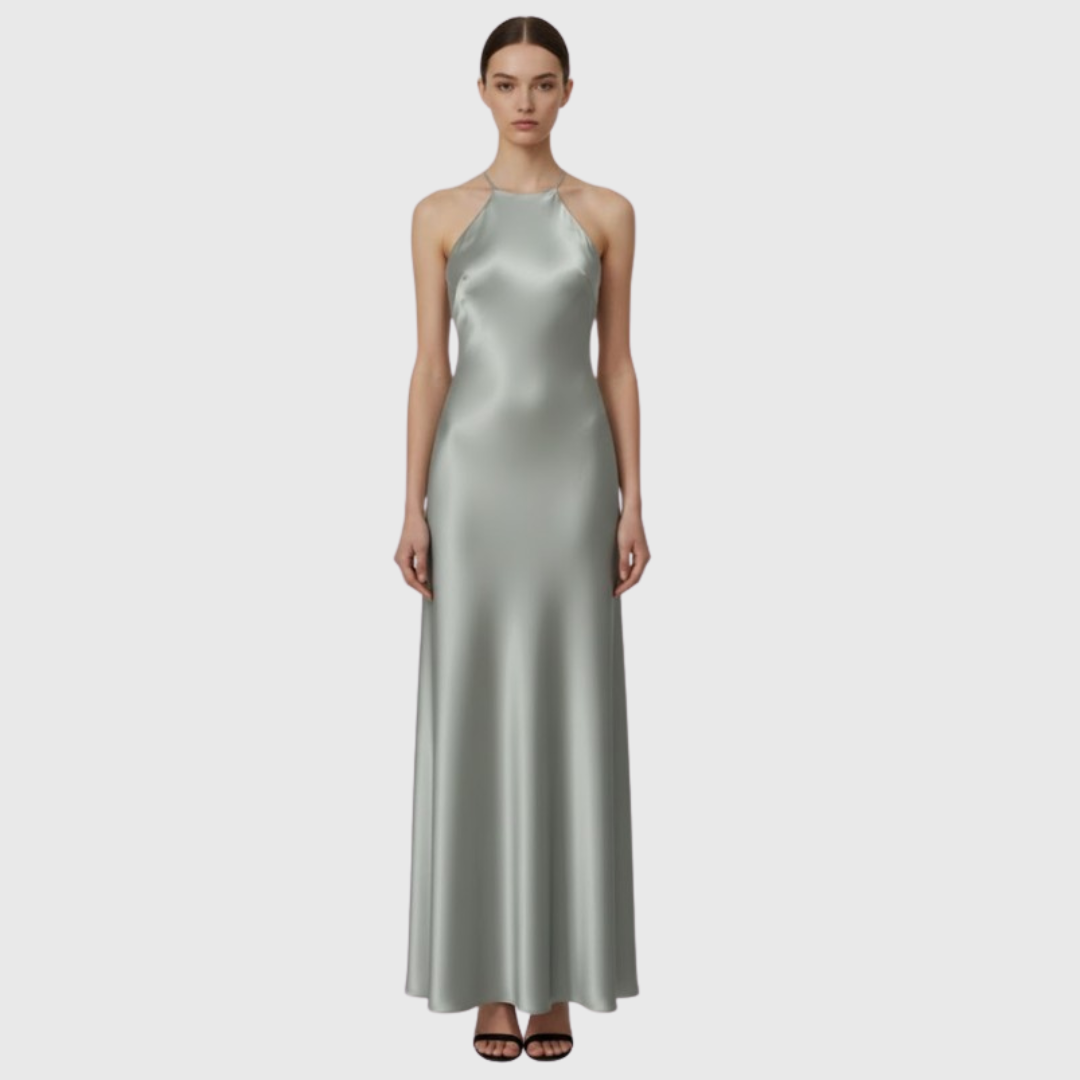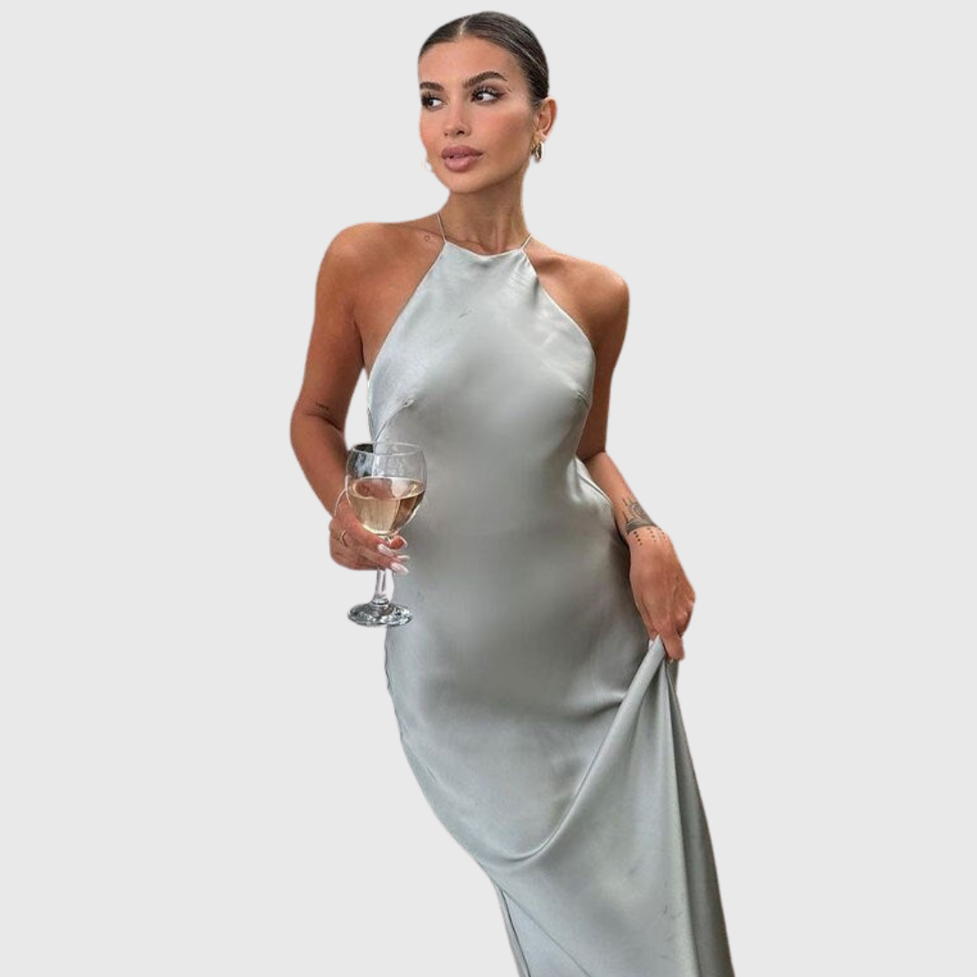 Este vestido maxi sin mangas presenta un escote tipo halter con caída suave y una espalda completamente descubierta. El corte largo acompaña el movimiento natural del cuerpo, creando una silueta limpia y estilizada pensada para celebraciones nocturnas y eventos formales.