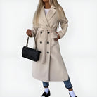 Su doble botonadura y el corte tradicional con cinturón realzan la figura y permiten crear un look elegante en cualquier ocasión.