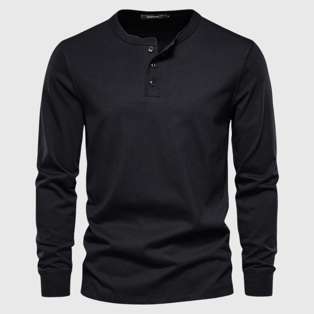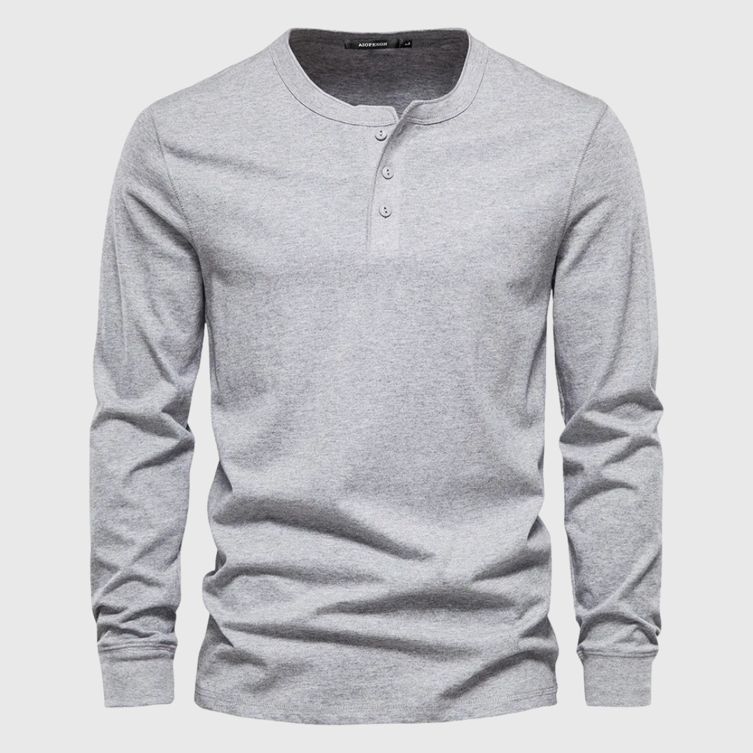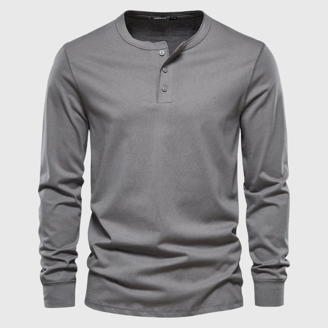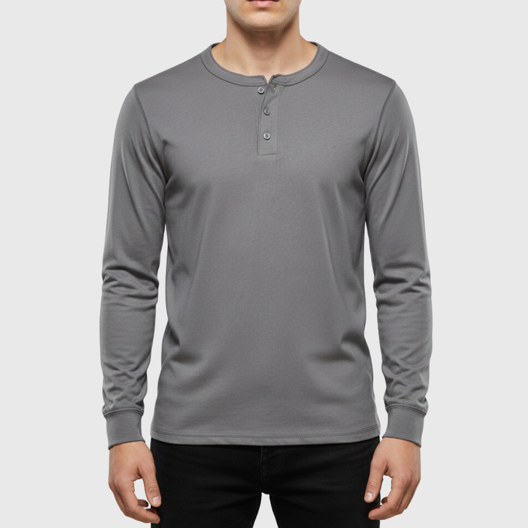 Esta camiseta Henley para hombre presenta un escote redondo con una pequeña tapeta de tres botones en la parte frontal. La superficie lisa y el corte recto crean un estilo sencillo y fácil de combinar, mientras los puños ajustados aportan un acabado definido en las mangas largas.